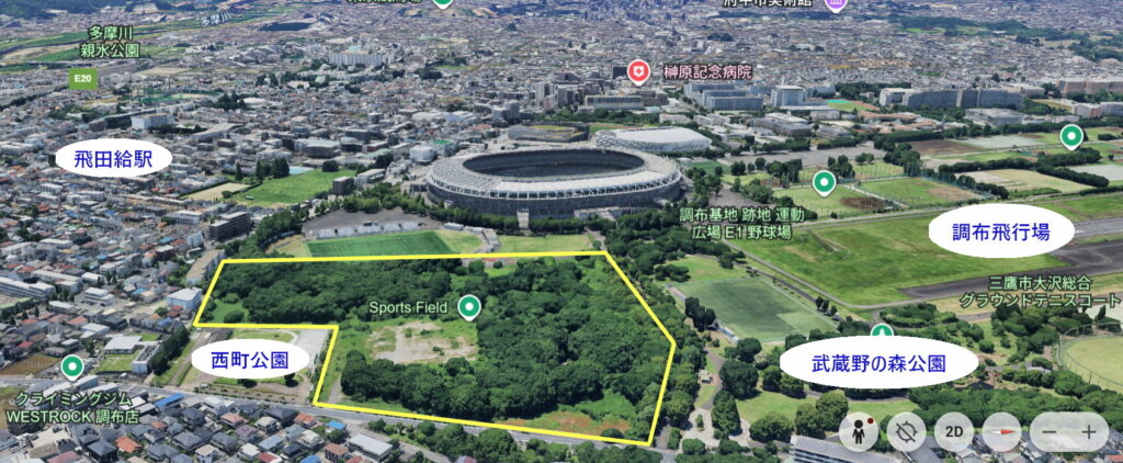 「調布基地跡地」は調布市と三鷹市、府中市にまたがる米軍基地跡地のうち、調布市内にある部分を指します。全体で203haある調布基地跡地は、すでに大部分が調布飛行場、味の素スタジアム、武蔵野の森公園や京王スポーツプラザなどに利用されていますが、西町公園を囲むように西北に広がる6haの土地は、財務省が保有するままで、最後の「留保地」となっています。