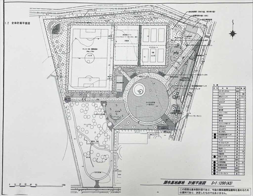 当時はまだ武蔵野の森公園の西町サッカー場もなく、こうした運動施設のニーズもありました。一方、樹木をできるだけ残してほしいという声も多かったため、樹木が比較的少ない北側に運動施設を配置し、南側は既存樹木を生かした広場を配置することにしていました。