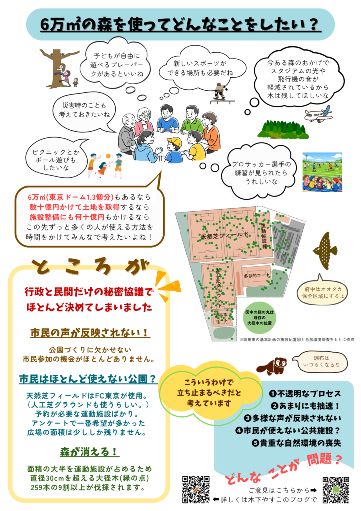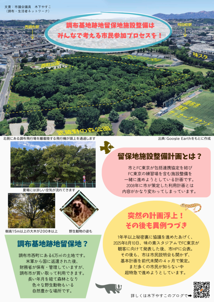 2026年1月9日 / 最終更新日 : 2026年1月9日 kinoshita blog 留保地施設整備に関するチラシを作りました 調布市の西部にお住まいの方でさえ、まだまだご存知ない状況のため、広くお伝えするためにチラシを作りました。 FacebookXHatenaCopy