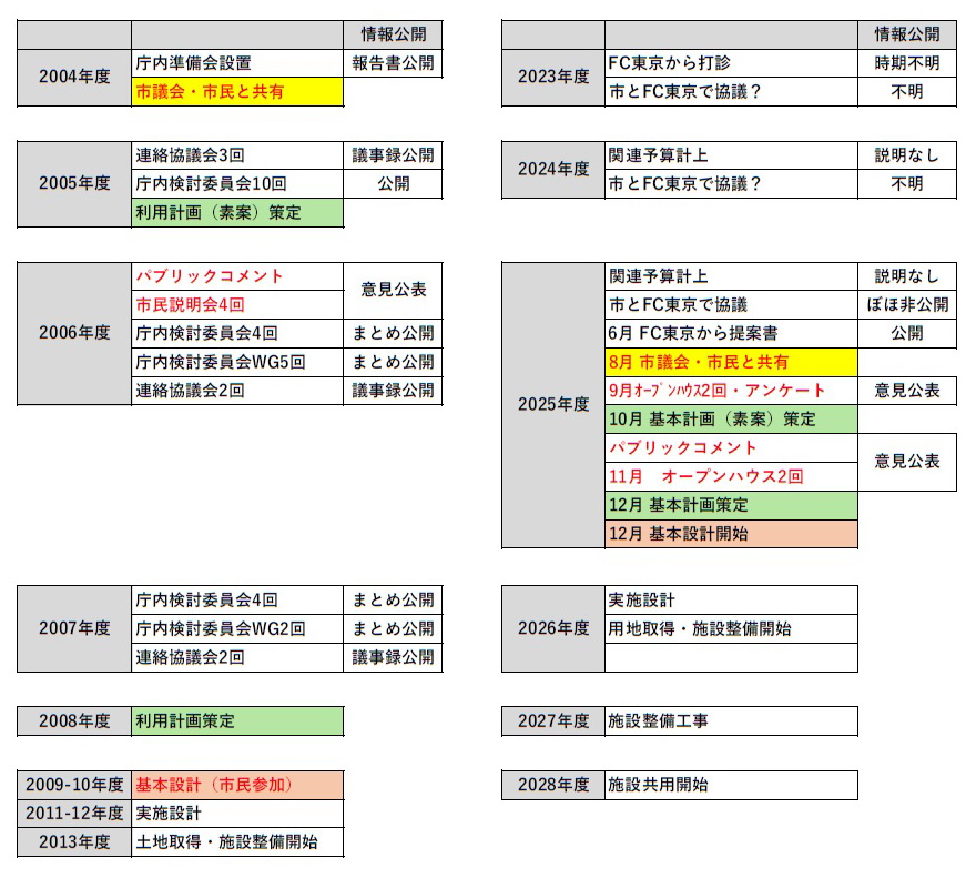 分かりやすくお伝えするために、2008年に市が同じ留保地の公園整備計画(「調布基地跡地留保地利用計画」)を作った時と進め方を比較したいと思います。