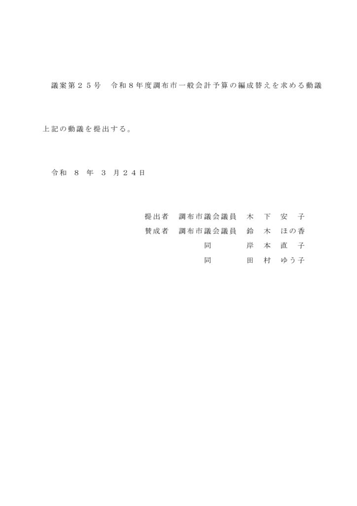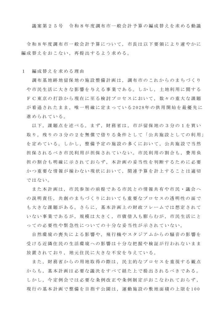 議案第25号 令和8年度調布市一般会計予算の編成替えを求める動議について説明いたします。