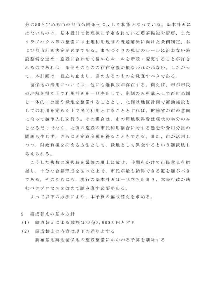留保地の活用には、こうした課題をクリアしつつ、同じゴールに到達できる他の道筋があります。複数の選択肢を議論の俎上に載せ、時間をかけて市民が納得できる道を選ぶべきです。そのためにも、一旦立ち止まり、プロセスを見直すため、関連経費を予算から削除し、総額35億3900万円を減額することを求めます。