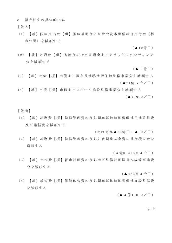 具体的には、歳入では、3つの款の4項目、計35億3900万円を減額し、歳出では3つの款の3項目、計40億2313万4千円を減額するとともに、差額の4億8413万4千円を財政調整基金に増額するという内容です。新年度、2000万円余しか計上されていない財政調整基金積立金を増額することにより、国保税等の引上げの影響を受ける市民生活支援の充実を期待するものです。ご賛同をお願いいたします。