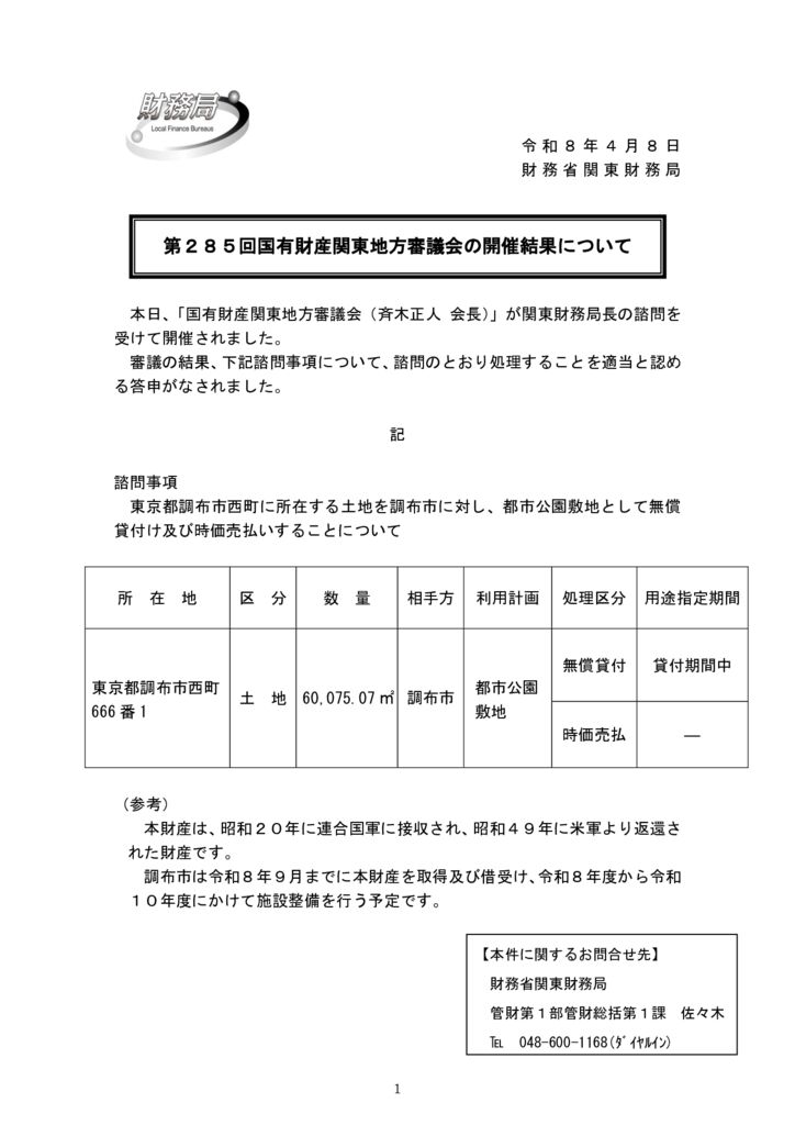 すると財務省は、「国有財産関東地方審議会」に対して「調布市への留保地売却を進めてもいいでしょうか?」と「諮問」し、審査してもらいます